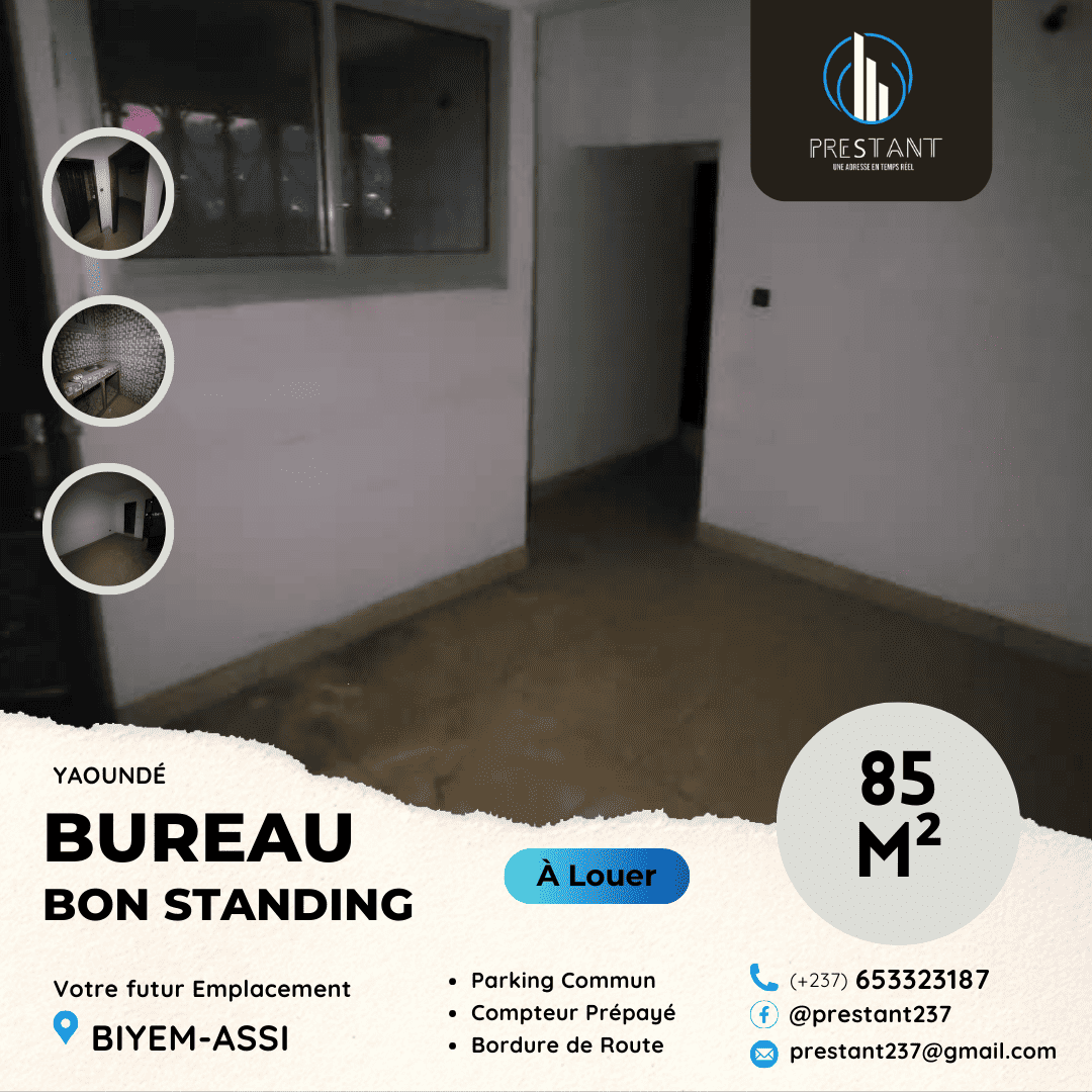 Grand Bureau Haut Standing à louer en Bordure de Route Principale à Biyem-Assi – Grande Pièce principale (Possibilité de répartir l’espace avec des murs en verre) – Toilette interne –…