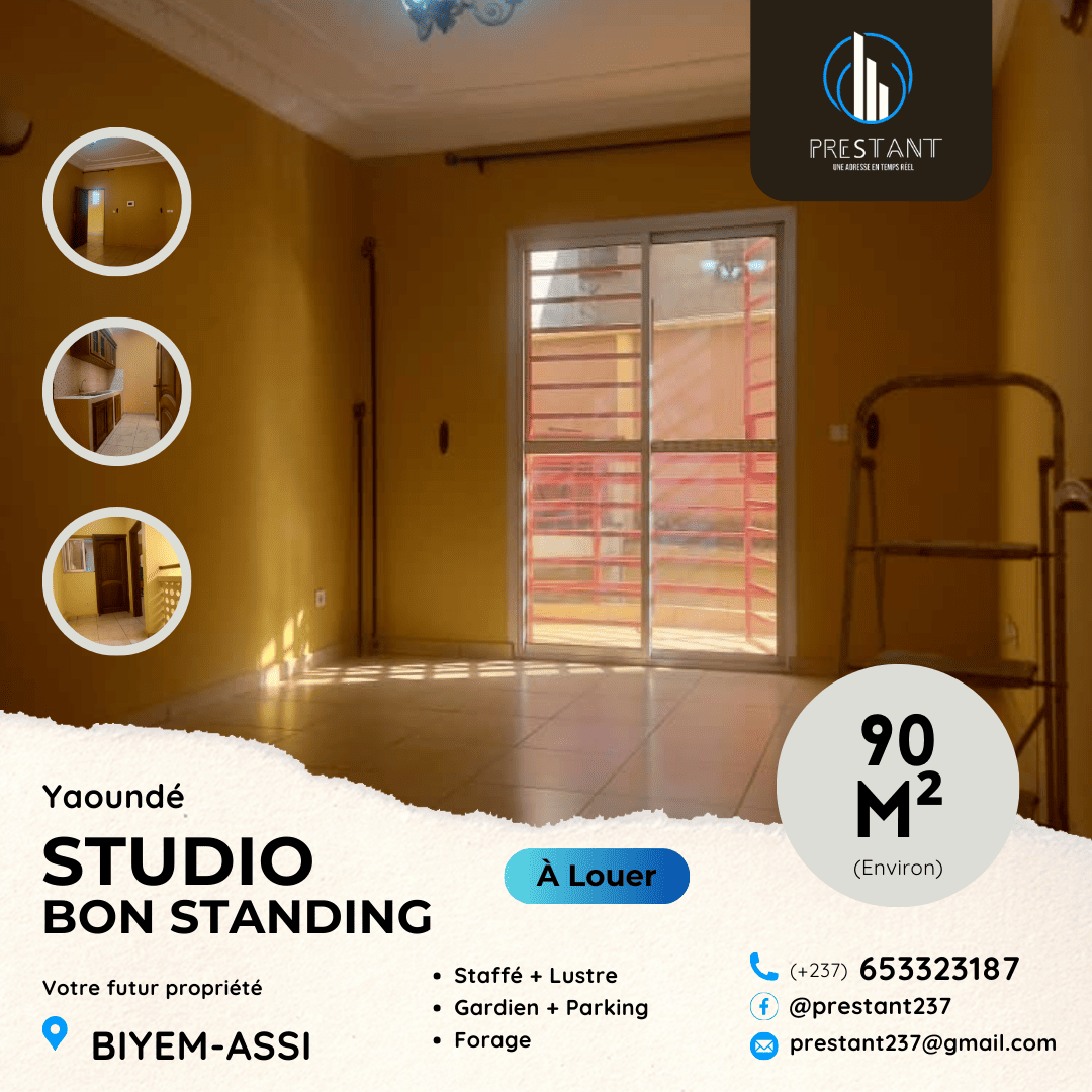 Joli Studio Moderne en cours finition à louer à Biyem-Assi : – Salon – Chambre avec Placard – Douche Magnifique – Cuisine avec Rangements – Situé en Bordure de Route…